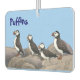 Puffins in der Erholung auf den Felsen. Es erscheint auch der Text "Puffins" mit individualisierbarem Text. Der Atlantische Puffin (Fratercula arctica) füttre vor allem durch Tauchen im Wasser. Sie züchten sich in großen Kolonien auf Küstensteilküsten oder vor der Küste gelegenen Inseln im Nordatlantik. Puffins vergossen die farbenfrohen äußeren Teile ihrer Rechnungen nach der Brutzeit, und verließ einen kleineren und langweiligen Schnabel. Ihre kurzen Flügel sind für das Schwimmen mit einer Flugtechnik unter Wasser angepasst. In der Luft schlagen sie schnell (bis zu 400 Mal pro Minute) bei einem schnellen Flug ihre Flügel und fliegen oft tief über der Meeresoberfläche.