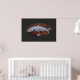 Auf diesem Bild befindet sich eine tropische Lachswand mit einem Süßwasser-Lachs mit einem Namensschild unter dem Fisch, der auf einer Holzplakette angebracht ist.