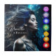 Friedliche Ai-Kunst, die eine wunderschöne Frau darstellt, die im Wind bläst und einen hübsch blauen himmlischen ätherischen Hintergrund hat. Zitat: "atmen und loslassen." Hübsch beleuchtete Chakras spirituelle Kunst.