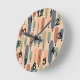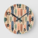 Diese Wanduhr hat ein modernes Design von langen Ovalen in Pfirsich, Grün, Blau, aquamarin und hellbraun mit schwarzen Linien mit Kreisen an den Enden.