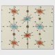 Ein Vintages abstraktes Kunstmuster aus der Mitte des Jahrhunderts, das mit den Retro-Sputnik-Sternexplosionen in Orange und Himmelblau kombiniert wird.