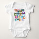 Dieser Baby-Bodysuit hat ein Design von Rechtecken, die sich an einem Ende in groben Farbtönen, orange, grün, aquamarin, lila, blau, rosa und gelb mit atomaren Linien ausstrecken.