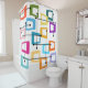 Dieser Duschvorhang hat ein rechteckiges Design, das sich an einem Ende in groben Farbtönen erstreckt, orange, grün, aquamarin, lila, blau, rosa und gelb mit atomaren Linien, die sie kreuzen.