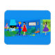 Dieses Atomic Palm Springs Cocktail Party Flexible Foto Magnet ist kitschig raffiniert in seiner fantastischsten! Das minimalistische Design der 1960er Jahre zeichnet sich durch einen modernen Steinkamin aus, der Mitte des Jahrhunderts in einem blauen Schatten steht und sich perfekt mit dem hellen Kobalt der Erholung des Wohnzimmers abstimmt. Durch die Glasschiebetüren kann man einen spektakulären Blick auf den tropischen Hinterhof genießen. Der Saal ist in einem zeitgemäßen Stil dekoriert, der mit modernen Kunstwerken, Wandkonturen mit Kegel, einem zweistufigen orangefarbenen Beistelltisch und einem olivgrün gestreiften Teppich ausgestattet ist. Die glamourösen Männer und Frauen trinken ihre orangefarbenen Martinis. Der Mann im hellblauen Anzug mit einer Bogen-Krawatte belebt Dinge, indem er den Glasfiberglasschatten von der Lampe nimmt und ihn auf den Kopf stellt, um die anderen Gäste zu amüsieren. Nun, es ist ein Party!