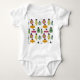 Dieser Baby-Bodysuit hat ein zeitgemäßes Weihnachtsdesign aus Ornamenten mit grauen Sternen, die hinter ihnen liegen.