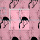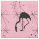 Atomic Sternexplosion MidCentury Modern Flamingo Wiederholung Muster Stoff für alle Ihre Retro Strand themed Nähprojekte. Schwarze Flamingo-Silhouette auf einem hellpastellrosa Hintergrund gefüllt mit modernen inspirierten Sternexplosion-Design-Elementen aus dem Mittelalter.