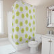 Dieser Duschvorhang hat ein modernes Design von bräunlichen Bögen, die auf weißem Hintergrund wiederholt werden. Die grün-goldgrünen Kreise mit dunkleren grün-goldenen Sternexplosionen in ihnen sind zu sehen.