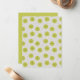This flat, blank notecard has a mid-century modern design of tan arches repeating on white as a background with repeating green-gold circles with darker green-gold starbursts inside them. Add your own personal message on the back.