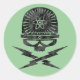 Schädel und Kreuzbolzen, mit Atom-Symbol und gekreuzten Blitzschrauben. Groß bedrängte Grafik, auf T - Shirt und Geschenken.