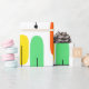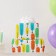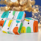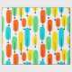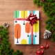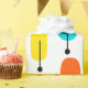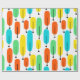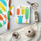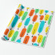 Dieses Umschlagpapier hat ein modernes Design von langen Ovalen in Gelb, Orange, Grün und Türkis mit schwarzen Linien mit Kreisen an den Enden.