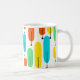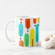 Diese Tasse hat ein modernes Design von langen Ovalen in Gelb, Orange, Grün und Türkis mit schwarzen Linien mit Kreisen an den Enden.
