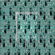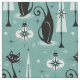 Meine originelle Vektorgrafik von Vintagen inspirierten Katzen, Weihnachtsbäumen, Ziergegenständen, Schnee und Sternexplosionen, in schwarz, rosa, Schattierungen von gedämpften aquamarin und ein Hauch von Elfenbein. ©Christine Duffield 2019-21.