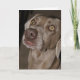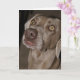 Ein aufmerksamer Weimaraner, der auf einer Grußkarte im vertikalen Format mit "I Liebe You" hinaufsucht.