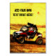 Risse eines verwegene Motorsportfahrers über dem Schmutz in seinem nebeneinander SXS Gebrauchsatv nicht für den Straßenverkehr oder in utv. Rot und Weiß färbten Farbe mit dem Zusammenbringen racegear und Sturzhelm, auf einem gelben und braunen Hintergrund. Gouache-Cartoonart malte Effekt abgeleitet von einer Vorlagensport-Aktionsphotographie.