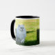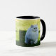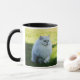 Schöne weiße Miezekatze hilft Ihnen, gehend mit Ihrem Morgenkaffee zu erhalten.