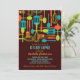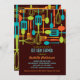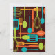 Retro Artwerkzeuge für das Kochen und das Essen werden auf dieser reizenden Einladung zu "Vorrat die Küche" Brautparty für Braut-zusein gekennzeichnet. Der Farbentwurf ist- Spaß und neutrale Person mit Gabeln, Löffel, Messer, Spachteln und wischt in den Schatten des Goldes, Braunen und weisen Grüns des Umber, Set gegen einen reichen Kastanienbraunhintergrund.