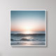 Dieses Bild erfasst eine ruhige Szene an der Küste bei Sonnenuntergang. Der Himmel ist in sanften Rosa- und Blautönen gestrichen, was eine beruhigende Kulisse schafft. Die Sonne, tief am Horizont, strahlt ein warmes Licht auf die sanften Wellen, die zum Ufer rollen. Das Wasser strahlt mit einem subtilen Funkeln, das das Licht von oben reflektiert. Der Sandstrand erstreckt sich in der Ferne und vermittelt ein Gefühl der Ruhe und Ruhe.