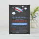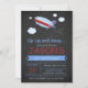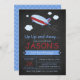 Passen Sie diese lustige Geburtstagsfeier-Einladung mit Ihren Party-Details an. Es zeigt eine niedliche Flugzeug- und Wolkendarstellung auf einem schwarzen Chalkboard-Hintergrund, für die perfekte Airplane-themed Geburtstagsparty.