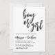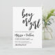 Es ist Zeit, das Geheimnis aus der Tasche lassen und Ihre besondere Ankündigung zu machen - Junge oder Mädchen? Unsere moderne Gender-Enthüllung Baby Dusche Einladung ist perfekt für den Anlass! Dieses polierte Design zeichnet sich durch eine schwarz-weiße Palette aus, die einen zeitlosen Look schafft. Geben Sie Ihre besonderen Neuigkeiten stilvoll und laden Sie Ihre Freunde und Familie ein, den großen Tag zu feiern!