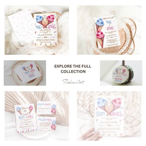 Ein minimalistisches, niedliches, Aquarellgeschlecht zeigt Servietten mit blauen und rosa Eiscremes mit modernen handgeschriebenen Schriften und einem niedlichen Konfetti-Hintergrund. Ideal für Sommergenussenthüllungen.