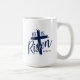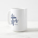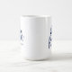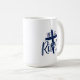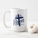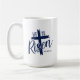 Die Kaffeetasse wird in navyblau und weiß mit einem 'Er ist auferstanden'-Druck gezeigt.