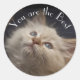 Ein blaues mit Augen, flauschiges, bezauberndes, weißes Kätzchen schaut nach oben auf die Bestätigung "You are the Best". Fügen Sie jemandem mit dem niedlichen Aufkleber einen positiven Gedanken hinzu.