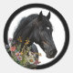 Schwarze Pferdeaufkleber. Wildblumen wachsen nahe am Kopf eines schönen schwarzen Pferdes. Er hat ein winziges Weiß im Gesicht, aber alles andere ist schwarz. Der Aufkleber ist weiß mit einem schwarz-grauen Rand. Rundaufkleber sind in zwei Größen erhältlich.