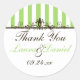 Diese 1,5" runde apfelgrüne und weiße Streifen mit braunen Rollen Gastgeschenk Hochzeit danke Ihnen Aufkleber passt zur Hochzeitseinladung unten gezeigt. Verwenden Sie es, um sich an Ihre Gastgeschenke Hochzeiten, oder als Umschlag Aufkleber für Ihre Dankeschön-Karten. Andere Formen und Größen sind erhältlich.