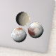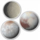 Diese Aufkleber zeigen die Zwergplaneten, die von Raumfahrzeugen nah aufgespielt wurden. Ceres wurde von der Dawn Raumsonde umkreist und fotografiert, während Pluto und Charon von der Raumsonde New Horizons fotografiert wurden.
