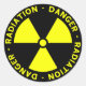 Schwarzer Aufkleber mit gelbem Strahlungssymbol und Warnhinweis.