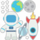 Niedliches Raumthema Astronaut, Raketenschiff, Planeten, Mond und Sterne, Vinyl Aufkleber.