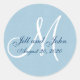 Blue Linen Monogram Wedding Initial Bride Groom Gunst Sticker oder für Hochzeitsempfang Umschlag Aufkleber. Vollständig anpassbar. Elke Clarke©2009. Andere Farben sind in unserer Monogram Gallery bei Zazzle erhältlich. Foto Effekt beige Leinenhintergrund mit weißem Monogramm und marineblau Skripttext. Ideal für ein rustikales Hochzeitsthema.