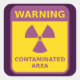 Warnung - Kontaminierter Bereich - gelbe und lila Beschriftung mit einem Warnsymbol für Strahlung.