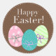 Der Rundaufkleber lautet: Happy Oaster mit dekorierten Eiern.