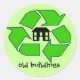 Recycle Pfeile in grünem Kreis ein grafisches Bild eines zweistöckigen Gebäude. Der Text "alte Gebäude" ist unten. Binder, Ordner, jede flache Oberfläche, um die Wiederverwendung der vorhandenen Infrastruktur zu fördern.
