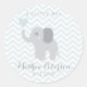 Rundaufkleber, der mit einer Geburtsankündigungskarte für einen kleinen Jungen mit niedlichem Elefanten und Herz, Handschrift und Zickzack Muster passt.
