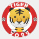 Der niedliche Tiger sieht durch einen Kreissaal, der mit Blume und Texten geschmückt ist. Dies ist eine digitale Abbildung.
