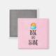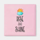 Ein Magnet mit niedlichem typografischem Design. Eine flauschige Wolke und ein orangefarbenes Set auf rosa Untergrund. Rise und Shine in einem coolen trendigen Schriftart geschrieben.