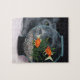 Eine schöne, graue, blaue, lange Haarkatze schaut in eine runde Goldfischschale mit einem großartigen Auge und Gesicht. Der Goldfisch sieht verblüfft aus, als er über den vielen bunten kleinen Kieselsteinen schwimmt.