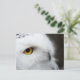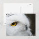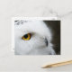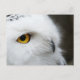 Ein Foto der Profilansicht einer schönen weißen, schneebedeckten Eule mit goldenen Augen.