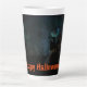Diese spuke schwarze Katze Latte Tasse ist sicherlich beängstigend. Diese Tasse zeigt eine Halloween-Szene mit einem Spuk Haus und einem Hintergrund einer wachsamen schwarzen Katze.