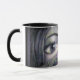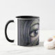 Ein flüchtige Blick mit leuchtenden Augen hinter einem orientalischen Ventilator. Schwarz-Weiß mit subtiler Schattierung. Eingerahmt von komplementären Farben und einem silbernen Rahmen. Handgemalt signierte Originalkunst.