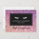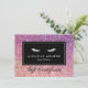 Koordiniert bis 1201Uhr mit der Vorlage für die Business Card Lila/rosa Glitzer mit den Eyelashes. Ein lila/rosa Glitzer-Bild füllt den Hintergrund dieses individuell anpassbaren Geschenkgutscheins für Wimpernschalen. Ein Paar weiße Wimpern ist das perfekte Branding für Wimpernverlängerungen, Make-up Künstler, Kosmetikunternehmen, Lash Bars und vieles mehr. Dieses Geschenkgutachten wird mit einem weißen Umschlag geliefert. © 1201AM CREATIVE
