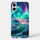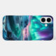 Northan-Lichter (Aurora Borealis), die vom Himmel über eine schneebedeckte Landschaft hinabsteigen, und ein Fluss, der das Auge in eine entfernte Stadt führt, leuchten in der Nacht durch Martinspixs.