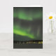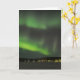 Grußkarte mit grünen Strahlen von Aurora borealis (Nordlichter) im nächtlichen Himmel über einem gefrorenen See in Lappland.