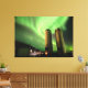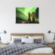 Diese wunderschöne gewickelte Leinenkunst hat ein atemberaubendes Bild eines Nachthimmels voller grüner Aurora Borealis, oder Northern Lights, über einem Paar Silos und einem Nebengebäude auf einer Alberta Farm an einer knusprigen Herbstnacht.