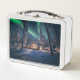 Schöne, weiße Lunchbox mit schönen Aurora Borealis über Winterhütte.