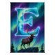 Bringen Sie strahlende nordische Schönheit in Ihre vier Wände mit diesem Aurora-Letter-E-Plakat. Ein leuchtendes E ragt über einem schneebedeckten Wald empor, beleuchtet von fließenden Bändern des Nordlichts in reichen Tönen von Smaragd, Türkis und Violett. Die Aurora schimmert über den nächtlichen Himmel und wirft einen sanften Schein auf die ruhige Winterlandschaft und beleuchtet sanft den friedlichen Elch, der majestätisch am Fuße des Monogramms steht.