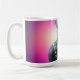 Artistic mug with a grayscale female portrait surrounded by dreamy pink, blue, and violet aurora tones, symbolizing calm, creativity, and light.