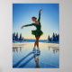 Eine elegante Art Déco Ölgemälde eines Eis-Skaters in einer auffallenden smaragdgrünen Kostüme, deren elegante geometrische Form durch das goldene Morgenlicht des Morgens beleuchtet wird, während sie über einen polierten, gefrorenen See gleitet.